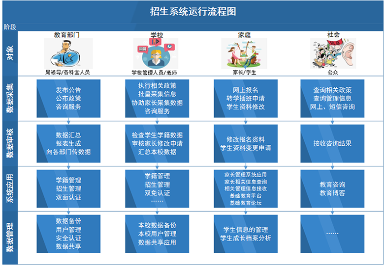 本系统针对从学生信息采集、报名开始到学习结束都有统一的管理,将学生报名、信息采集、资质审核全部电子信息化,实现教育信息的共享与资源的优质管理。力求从教育管理部门到学校、从学校到家长,数据畅通、资源共享、系统安全、操作简便,为教育系统提供全方位应用服务的信息化环境。