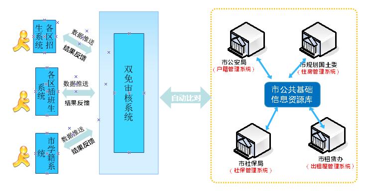 (3) 数据比对验核,打通政府各部门信息共享,实现“数据多跑路,群众少跑腿”,家长无须开证明,无须到现场,在线提交材料即可实现入学报名。