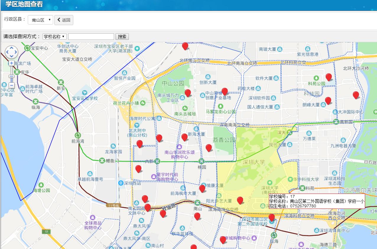 1. 在线学区电子地图,可划分学区、大学区等多种学区地图,家长在线查看居住地所属学校。