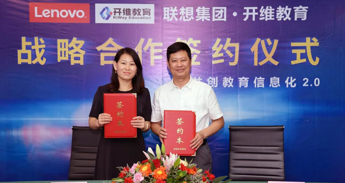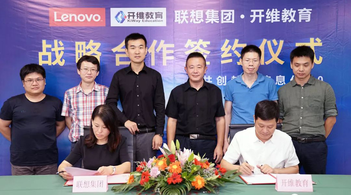 9月21日,联想集团与开维教育举行战略合作协议签约仪式,联想集团MIA高级经理李束与开维教育董事长钟千里分别代表双方签署战略合作协议, 标志着双方合作关系正式确立。联想集团MIA高级方案销售经理孙云涛、技术支持万金国,开维教育副总经理吴志港、副总经理赵林、总经理助理张振中、高级工程师郑康亲临签约现场,共同见证签约仪式。