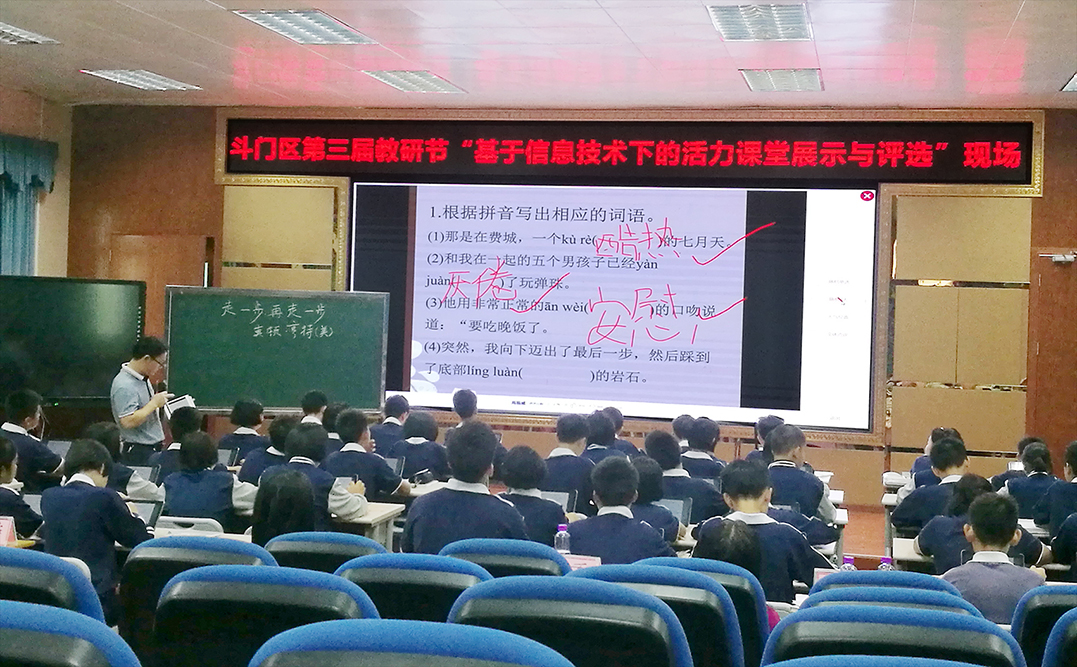 11月14日、15日,斗门区城东中学、井岸四小是开维教育合作多年的学校单位,本次活动两校分别使用我司产品参评基于信息技术下的“活力课堂”展示中学组、小学组活动。现场代表老师利用开维教育备课平台制作的精美课件,通过娴熟的应用操作与高效互动全面展示了开维教育“走动教学”、“智慧互动课堂”课中实况表现。精彩生动的授课内容和形式吸引了众多观众围观,领导们驻足观看,获得群众一片赞赏。
