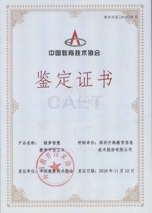 2018年11月12日,中国教育技术协会“绿萝智慧教学平台2.0”专家鉴定会在深圳大学国际会议厅举行。开维教育智慧教学事业部负责人赵林向鉴定专家组汇报了自主研发的“绿萝智慧教学平台2.0”的工作报告、技术报告、用户报告,详细介绍了平台的设计架构、关键技术、应用价值及应用场景等,专家组审阅了相关鉴定资料,并进行了现场质询,经过认真讨论,形成鉴定意见,通过了中国教育技术协会组织的专家鉴定。
