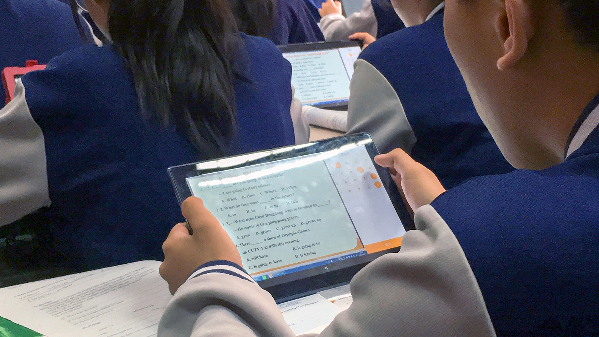 课堂上李老师不时会穿插一些简短的问题来测评学生的学习掌握情况,通过教师端一键发送学生题目后,学生在自己座位上就能够提交答案。