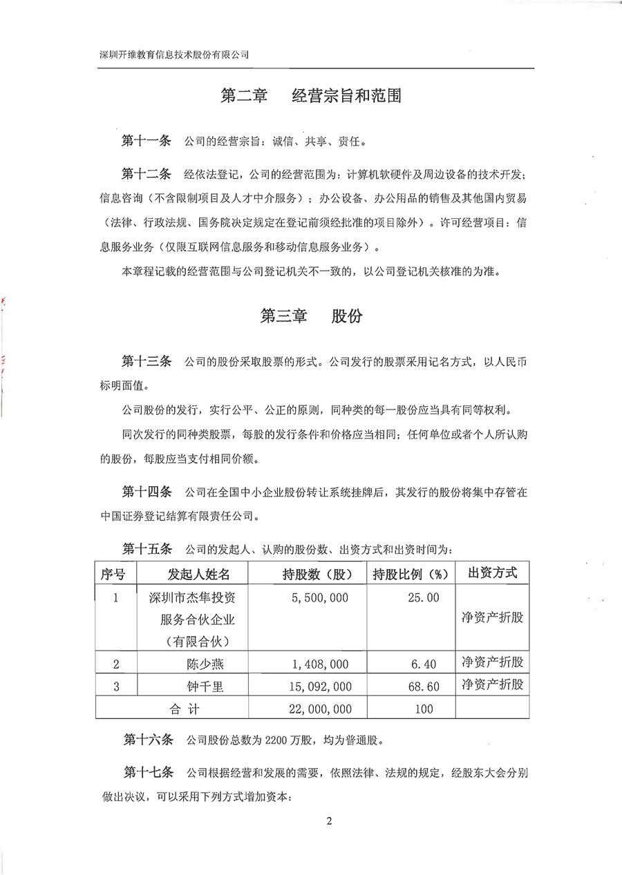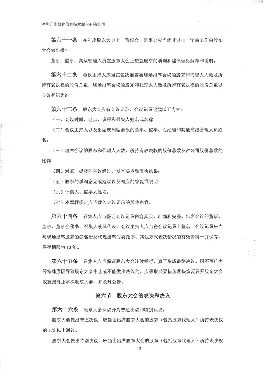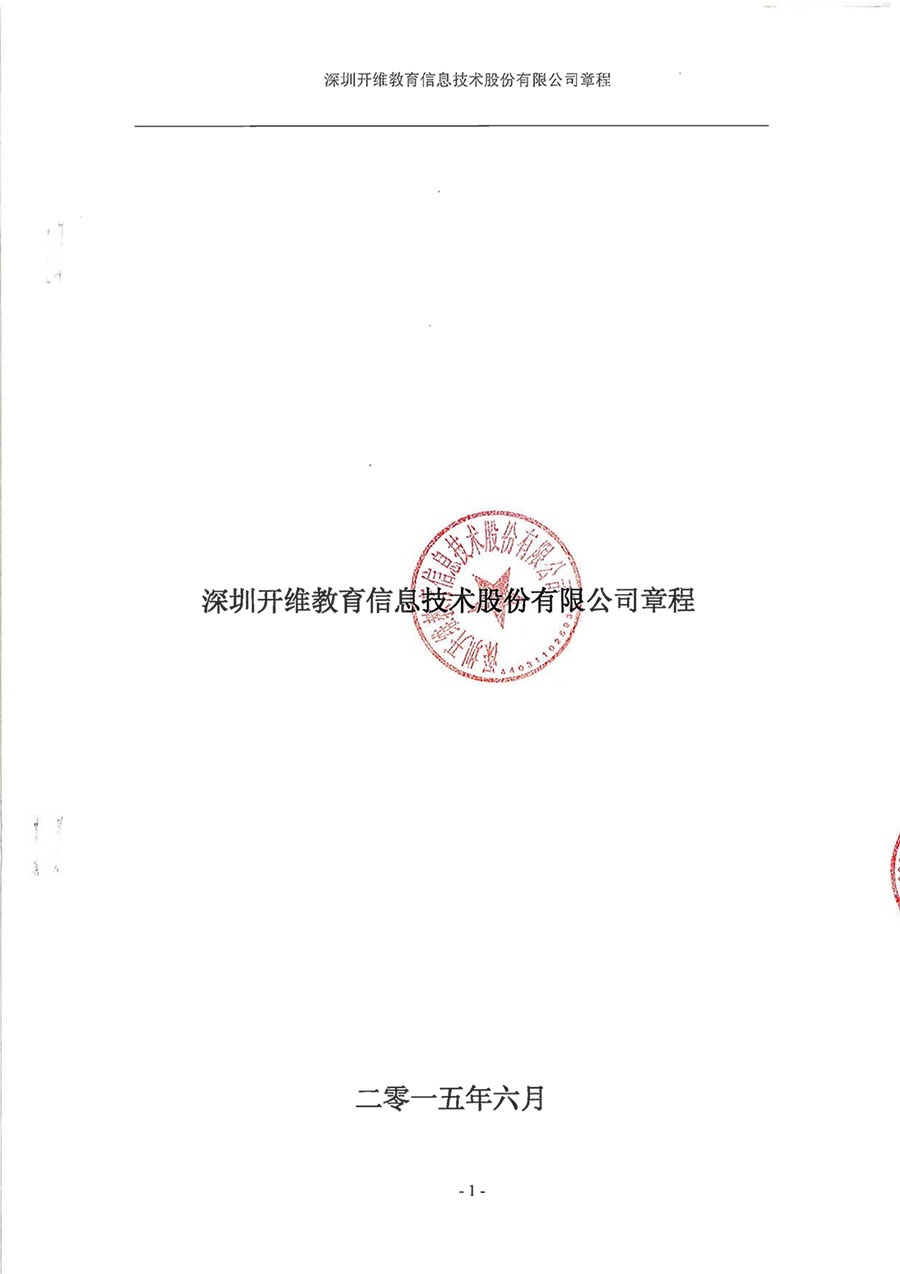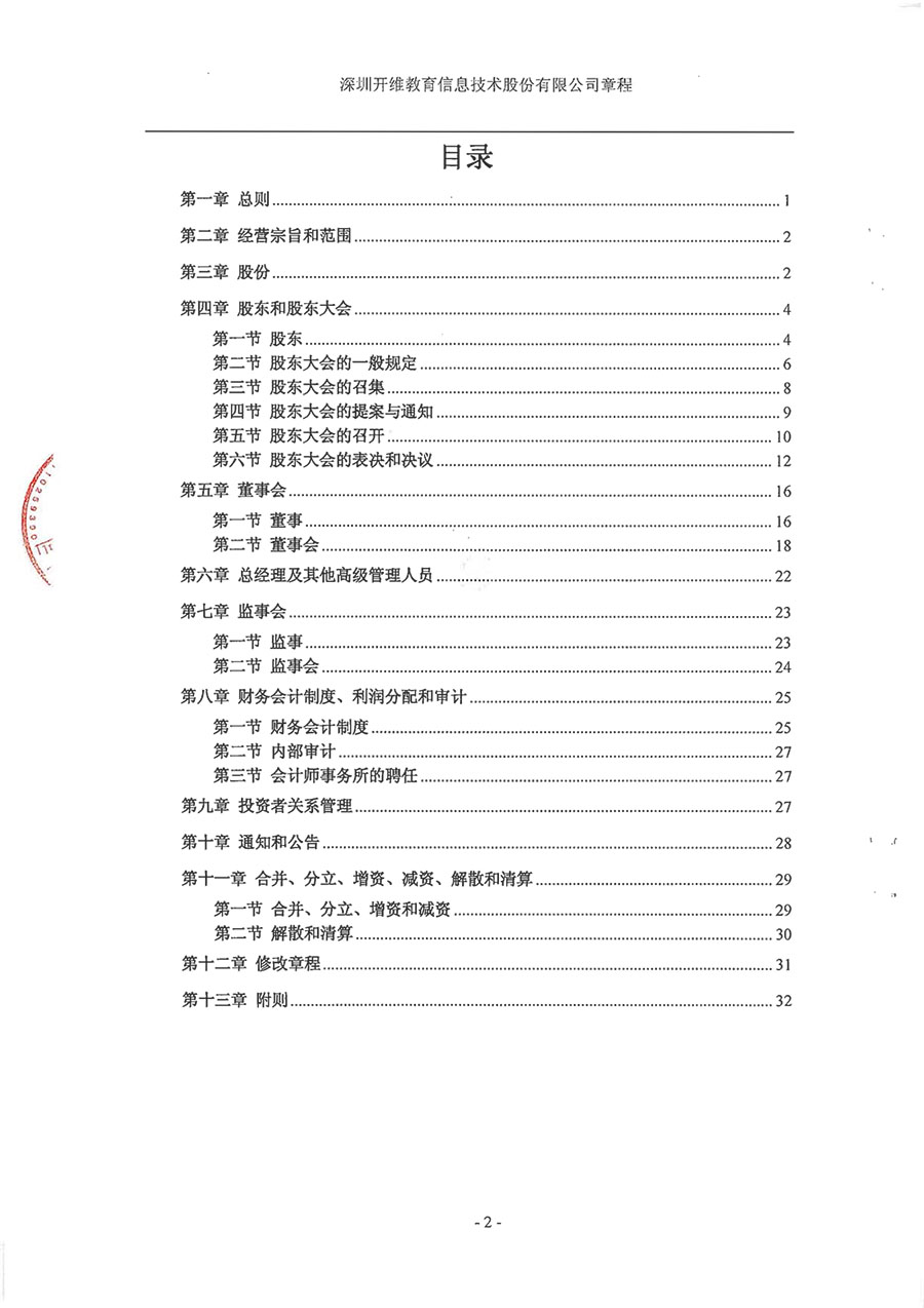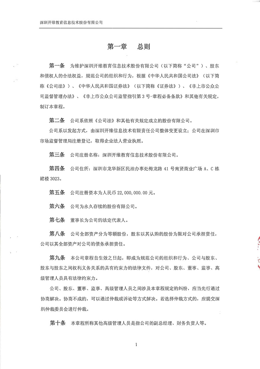 摘要:为维护深圳开维教育信息技术股份有限公司、股东和债权人的合法权益、规范公司的组织和行为,根据《中华人民共和国公司法》、《中华人民共和国证券法》、《非上市公众公司监督管理办法》、《非上市公众公司监管指引第3号-章程必备条款》和其他有关规定,制定本章程。