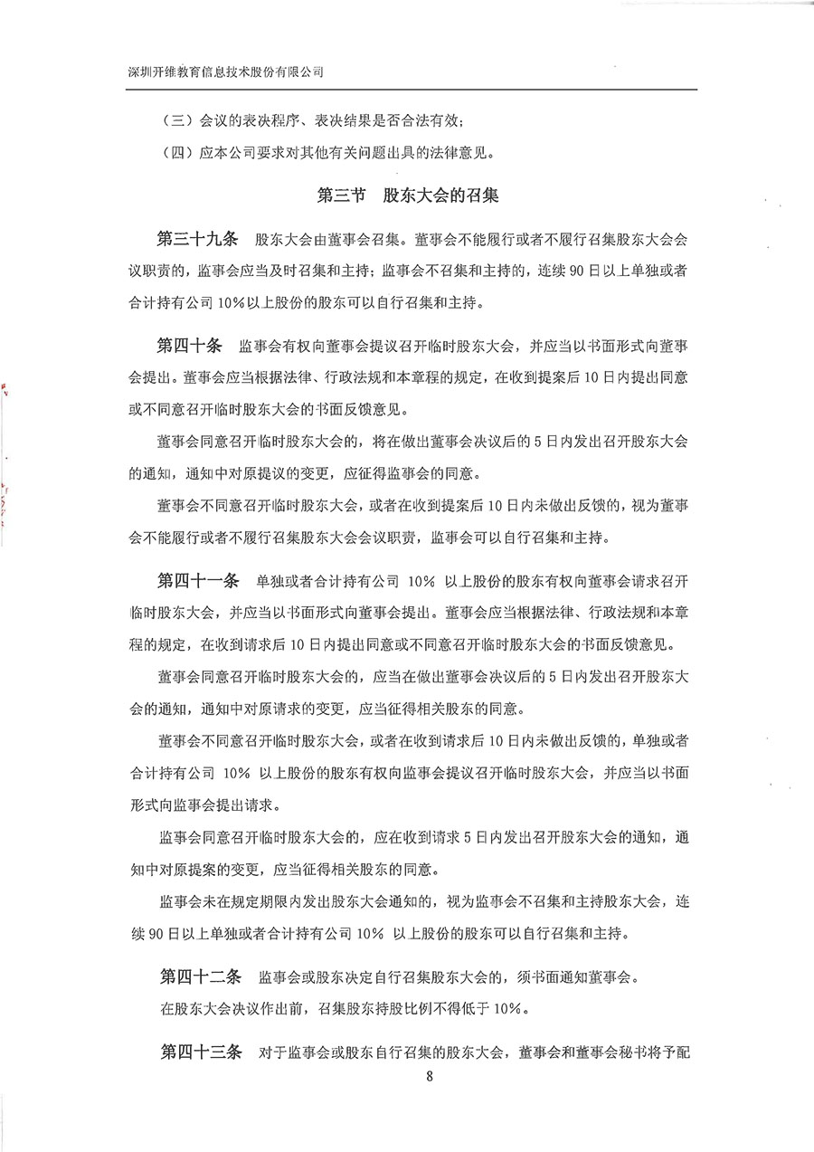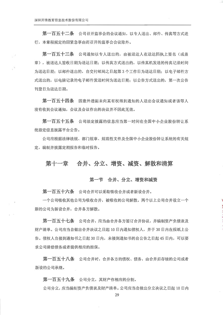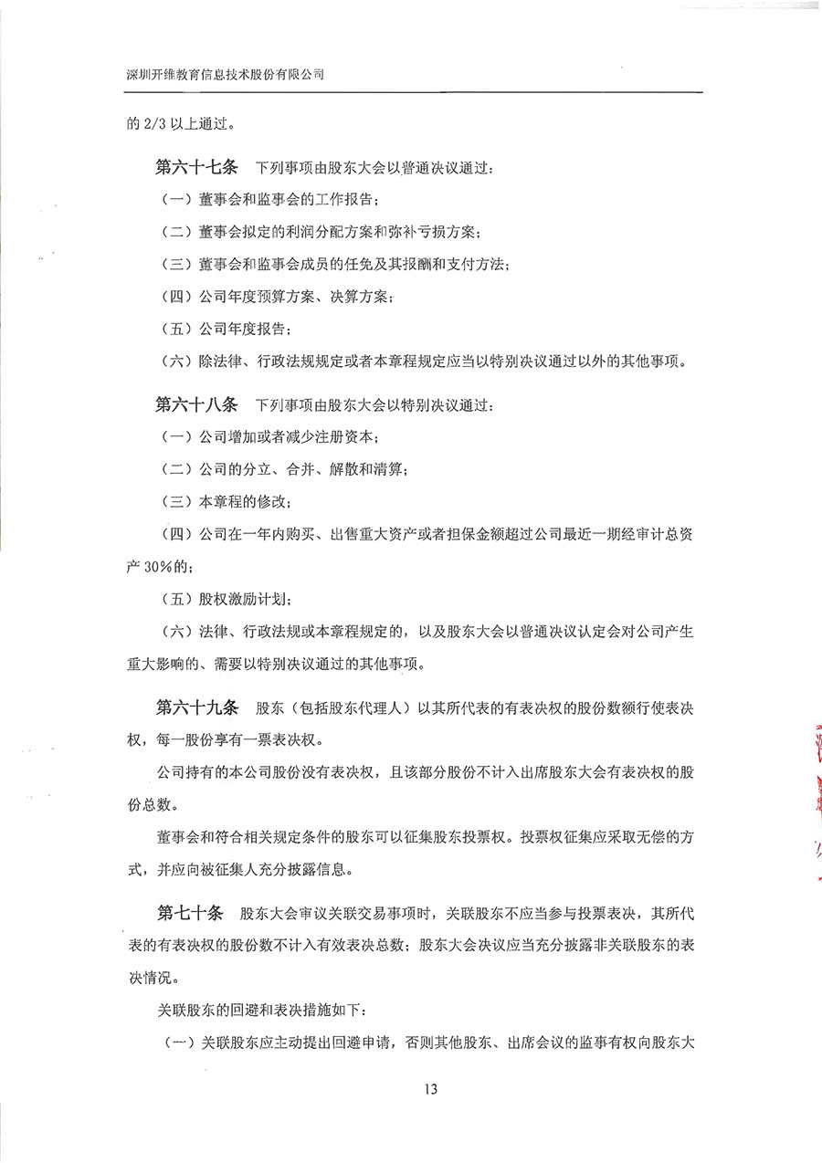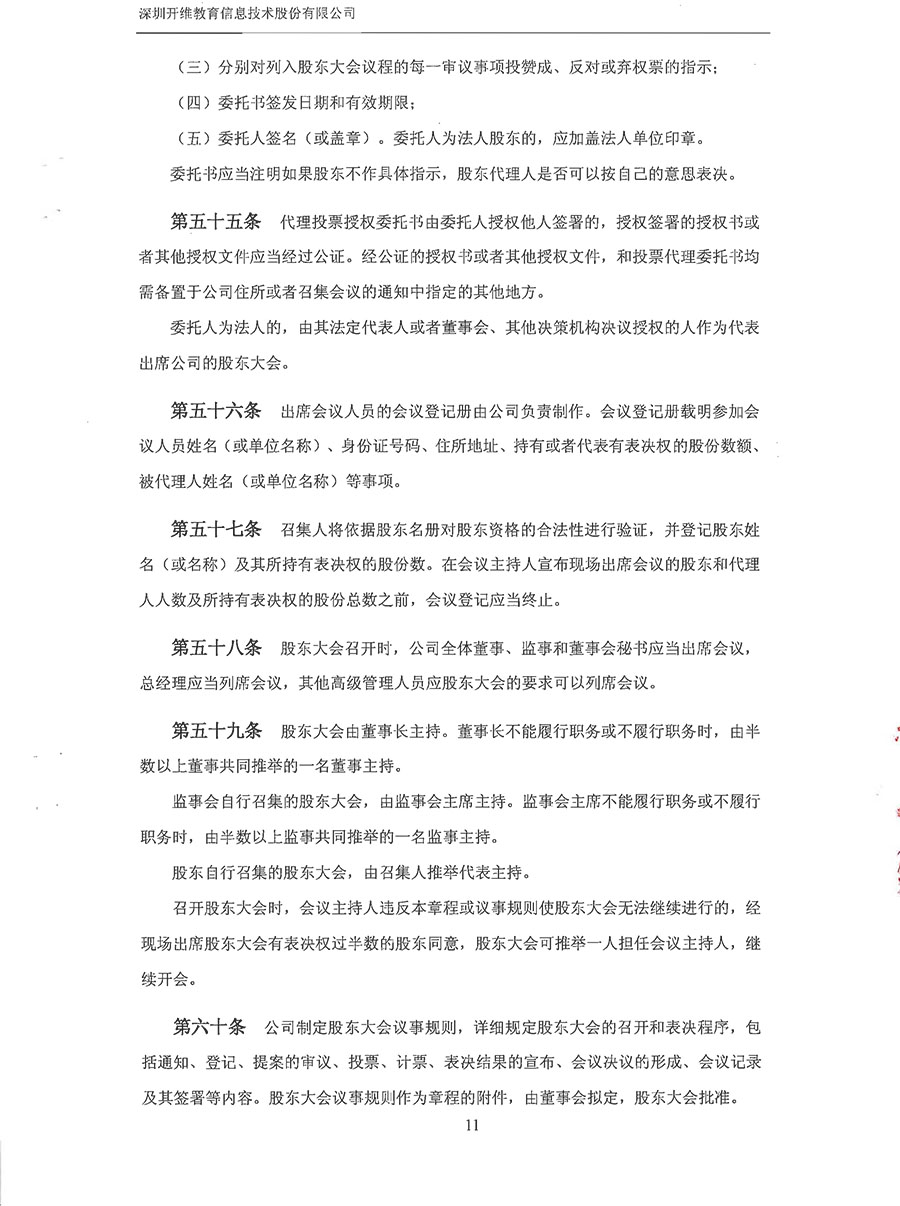摘要:为维护深圳开维教育信息技术股份有限公司、股东和债权人的合法权益、规范公司的组织和行为,根据《中华人民共和国公司法》、《中华人民共和国证券法》、《非上市公众公司监督管理办法》、《非上市公众公司监管指引第3号-章程必备条款》和其他有关规定,制定本章程。