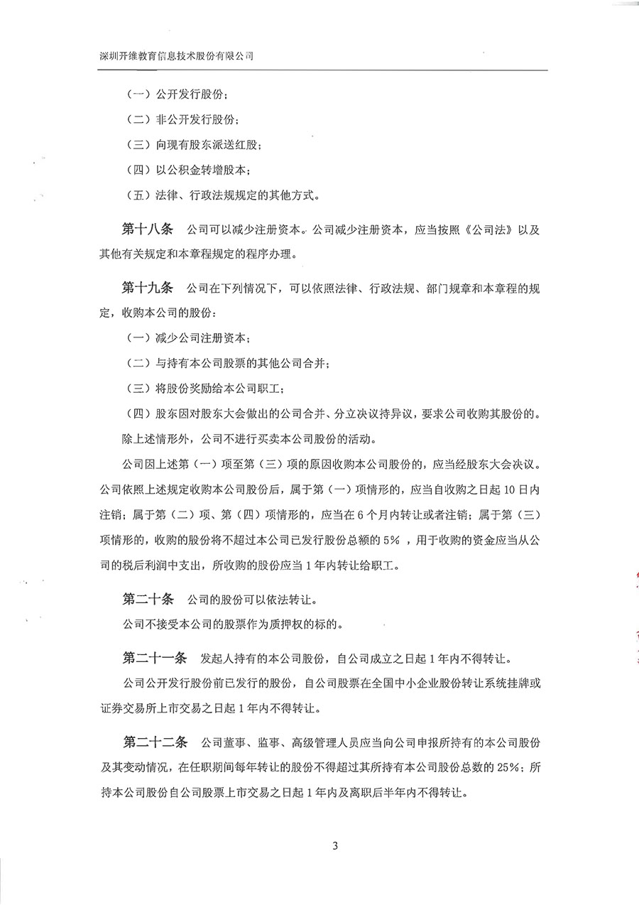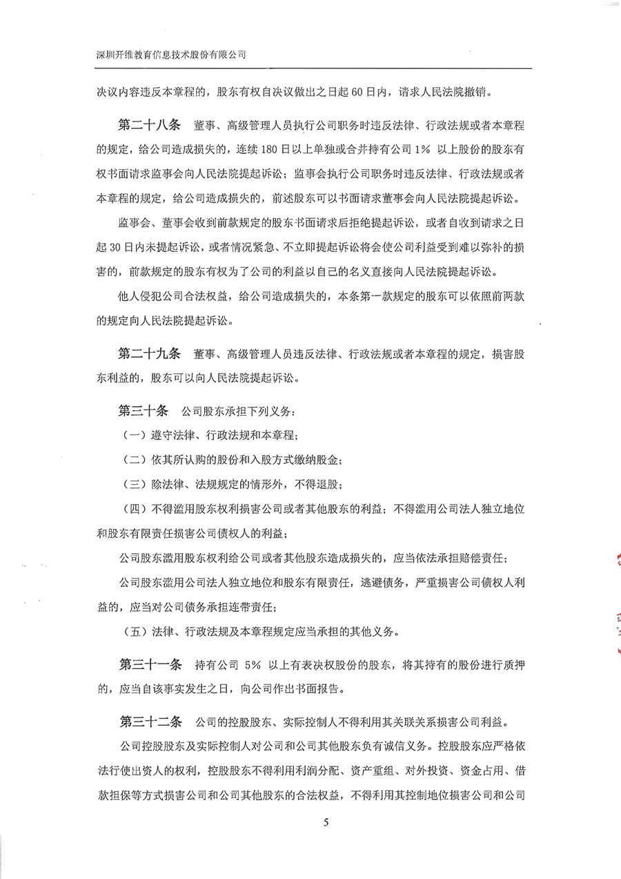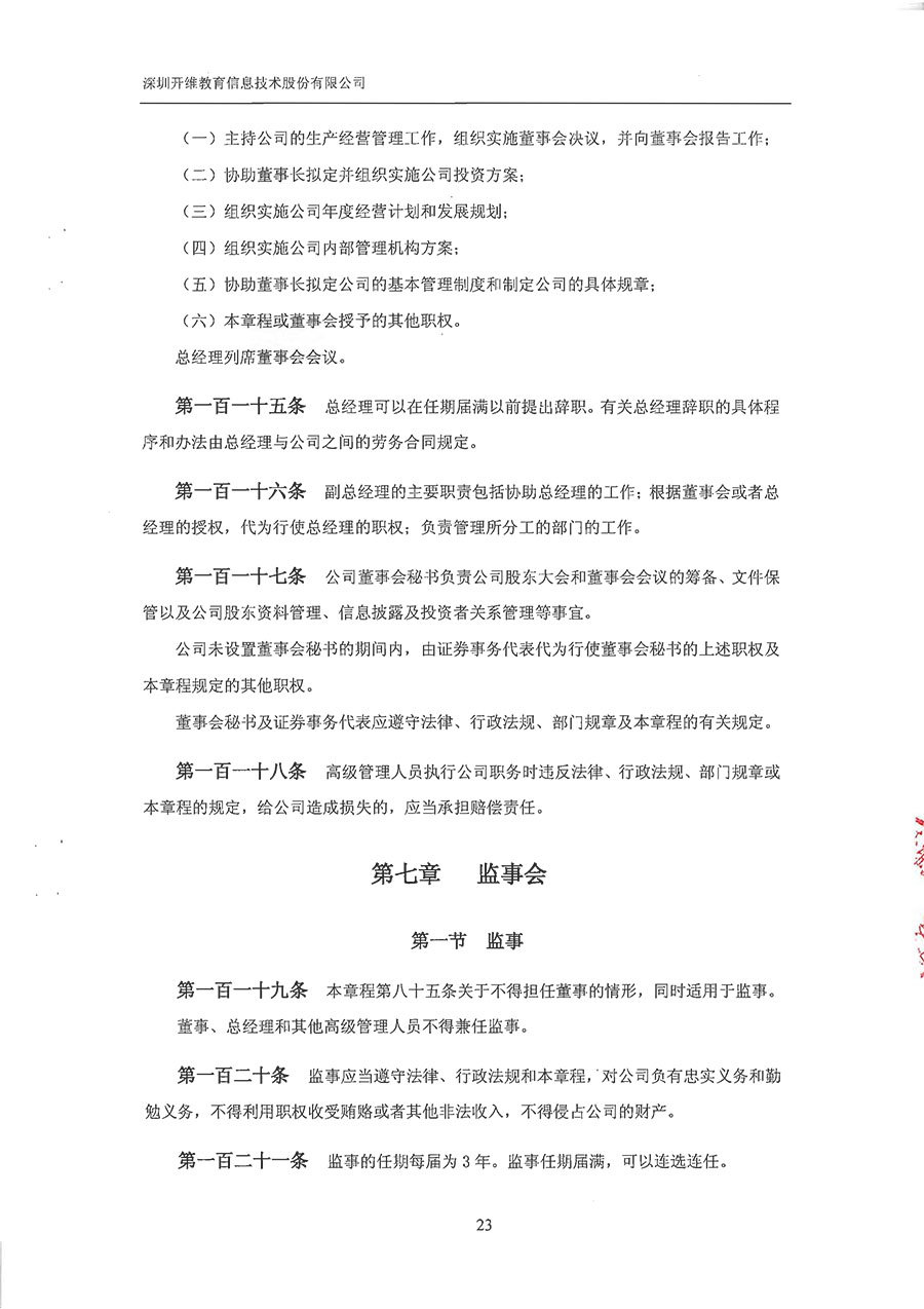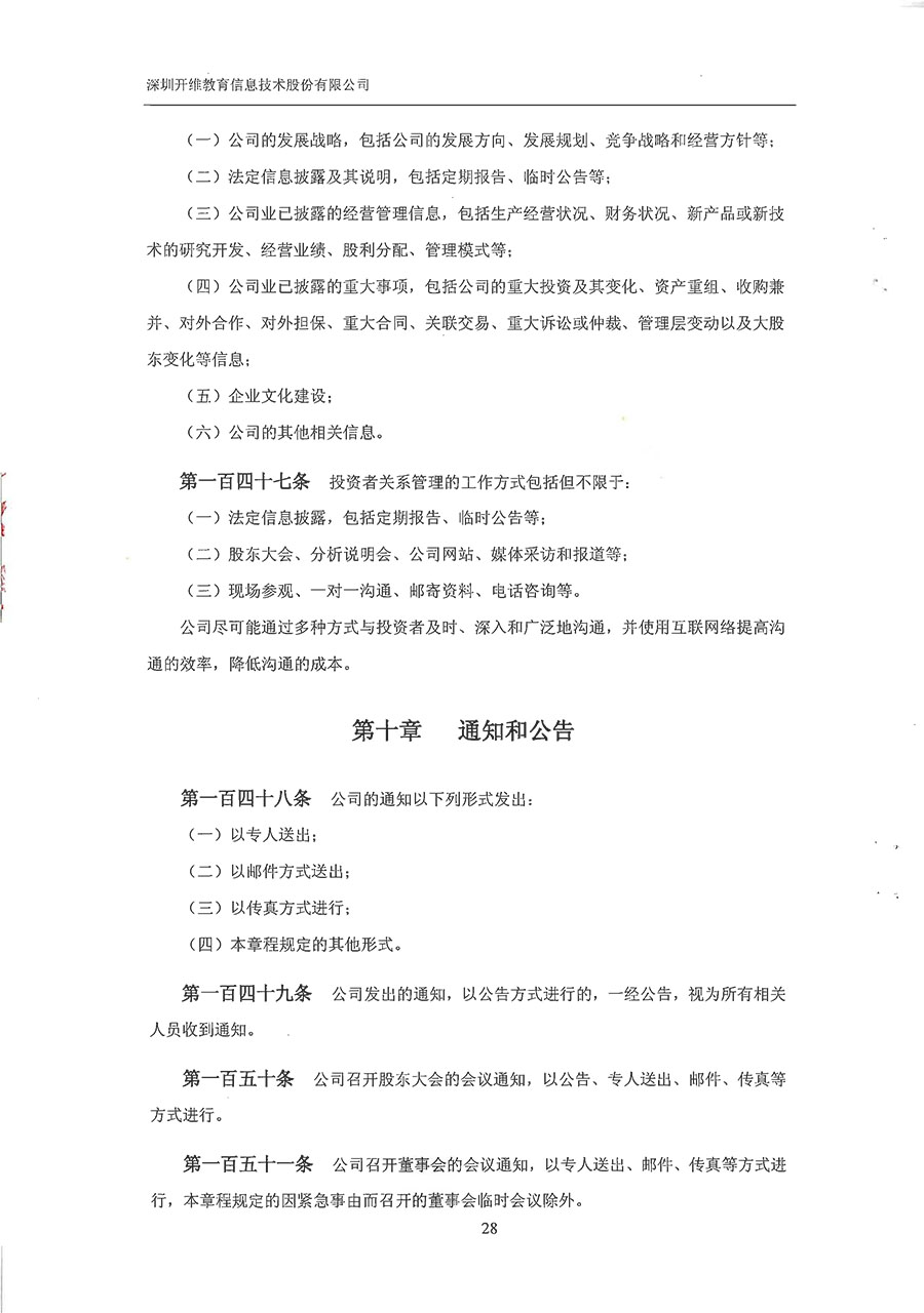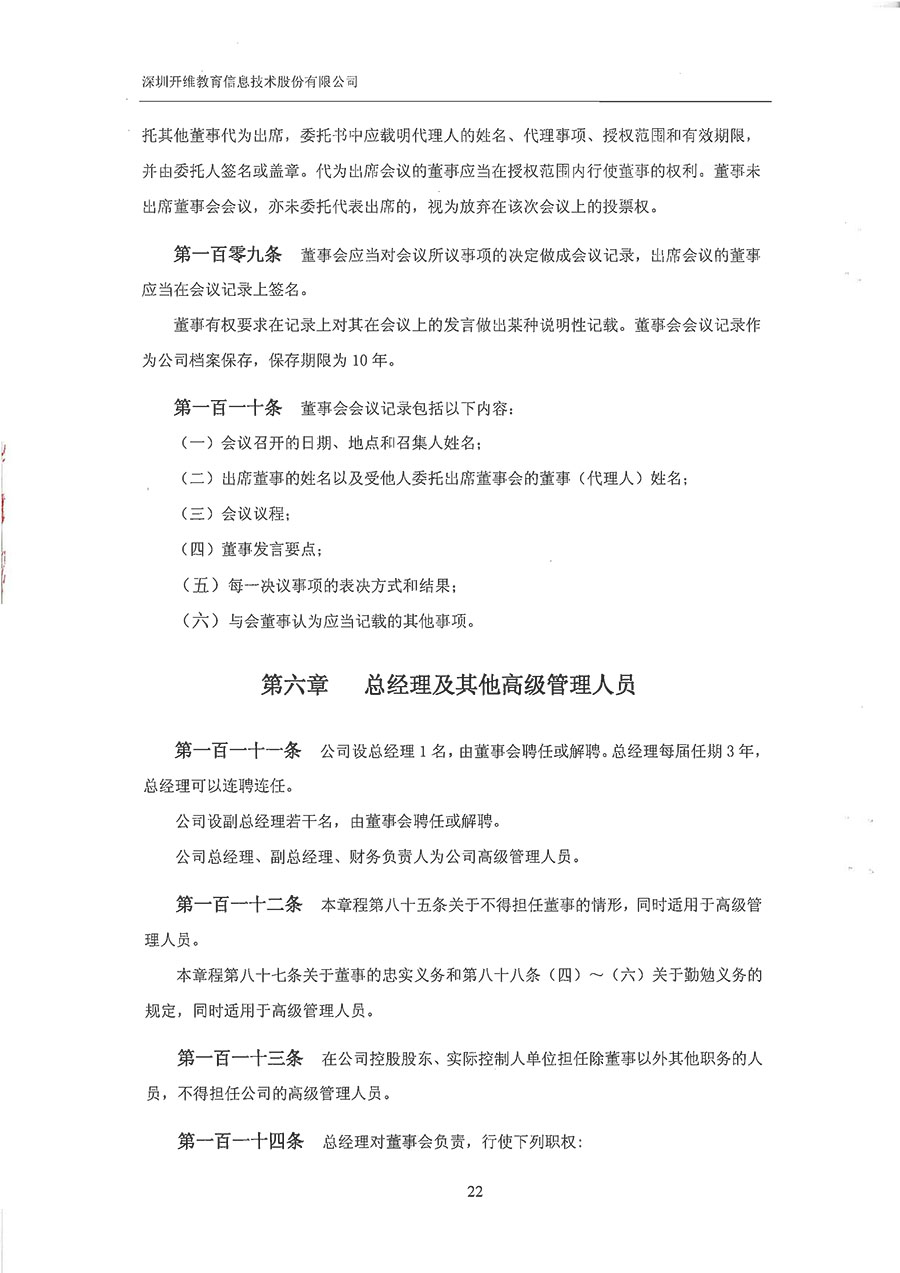 摘要:为维护深圳开维教育信息技术股份有限公司、股东和债权人的合法权益、规范公司的组织和行为,根据《中华人民共和国公司法》、《中华人民共和国证券法》、《非上市公众公司监督管理办法》、《非上市公众公司监管指引第3号-章程必备条款》和其他有关规定,制定本章程。