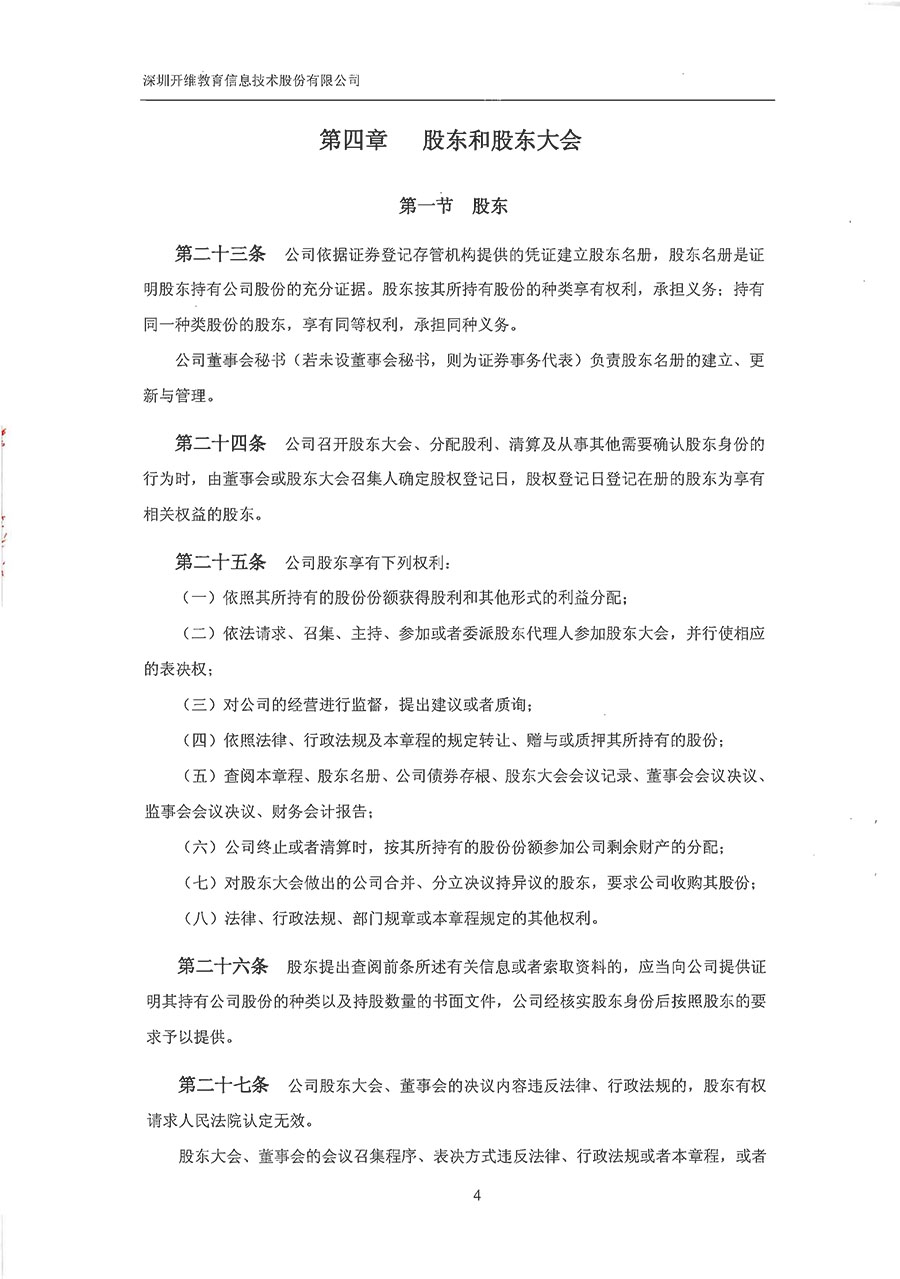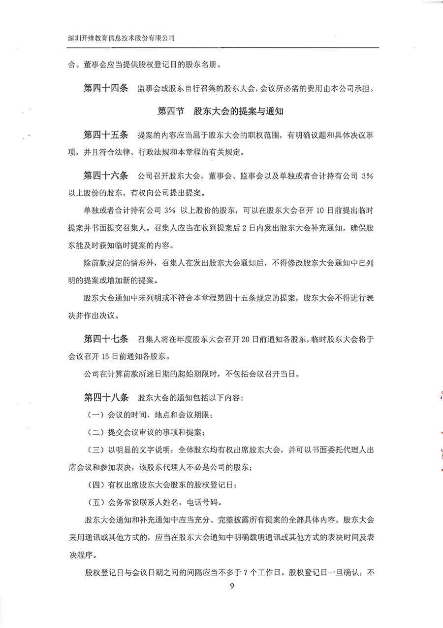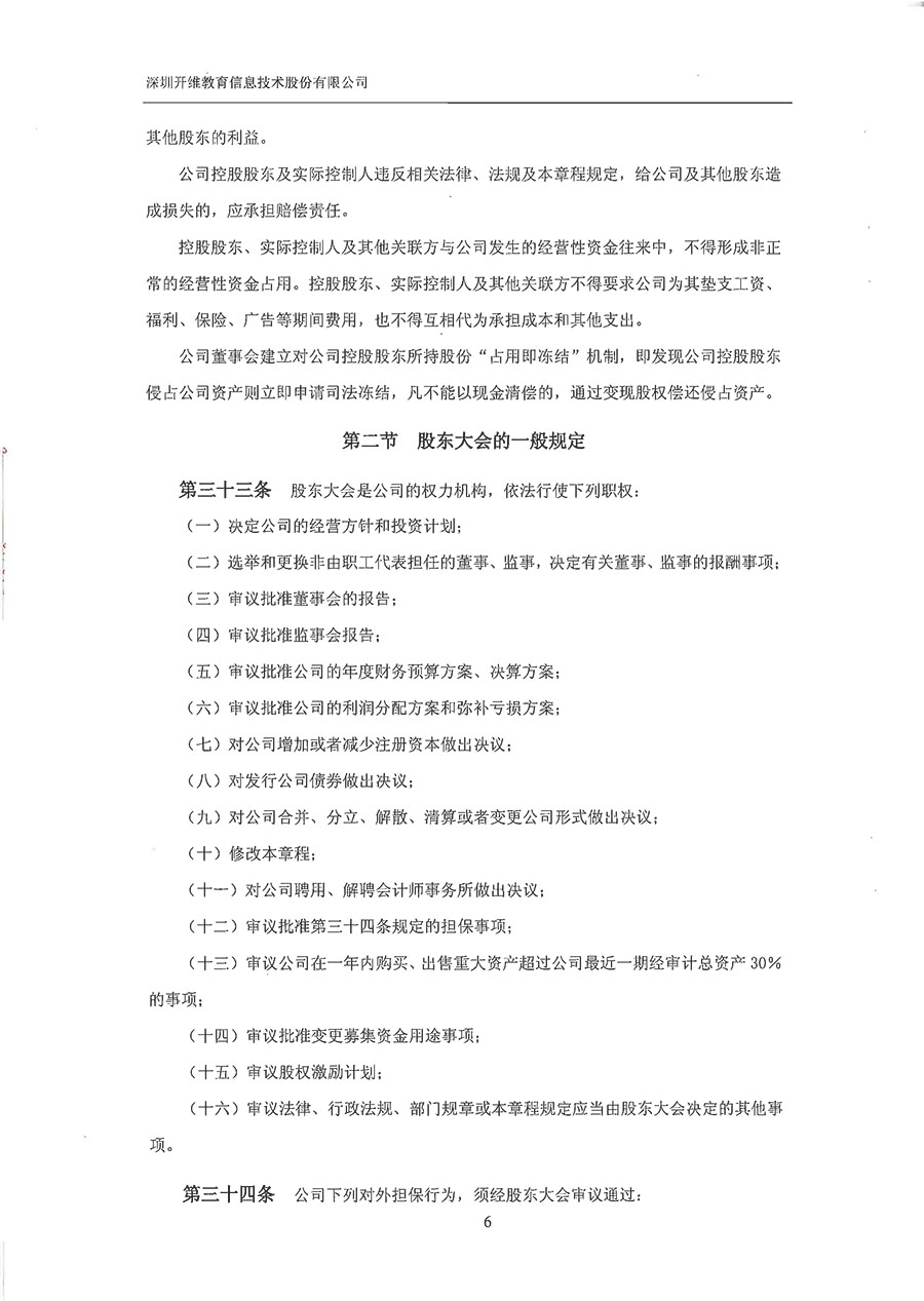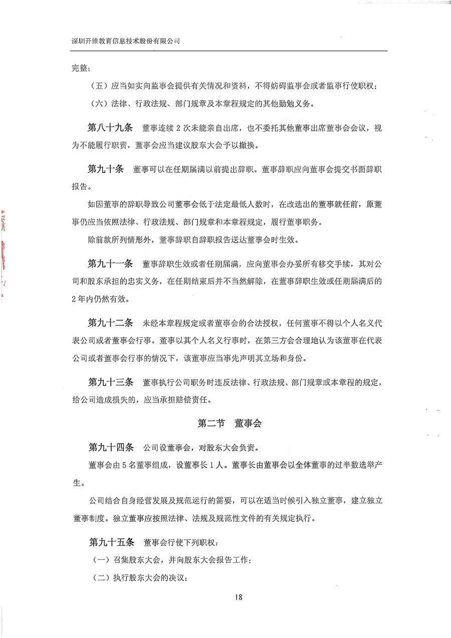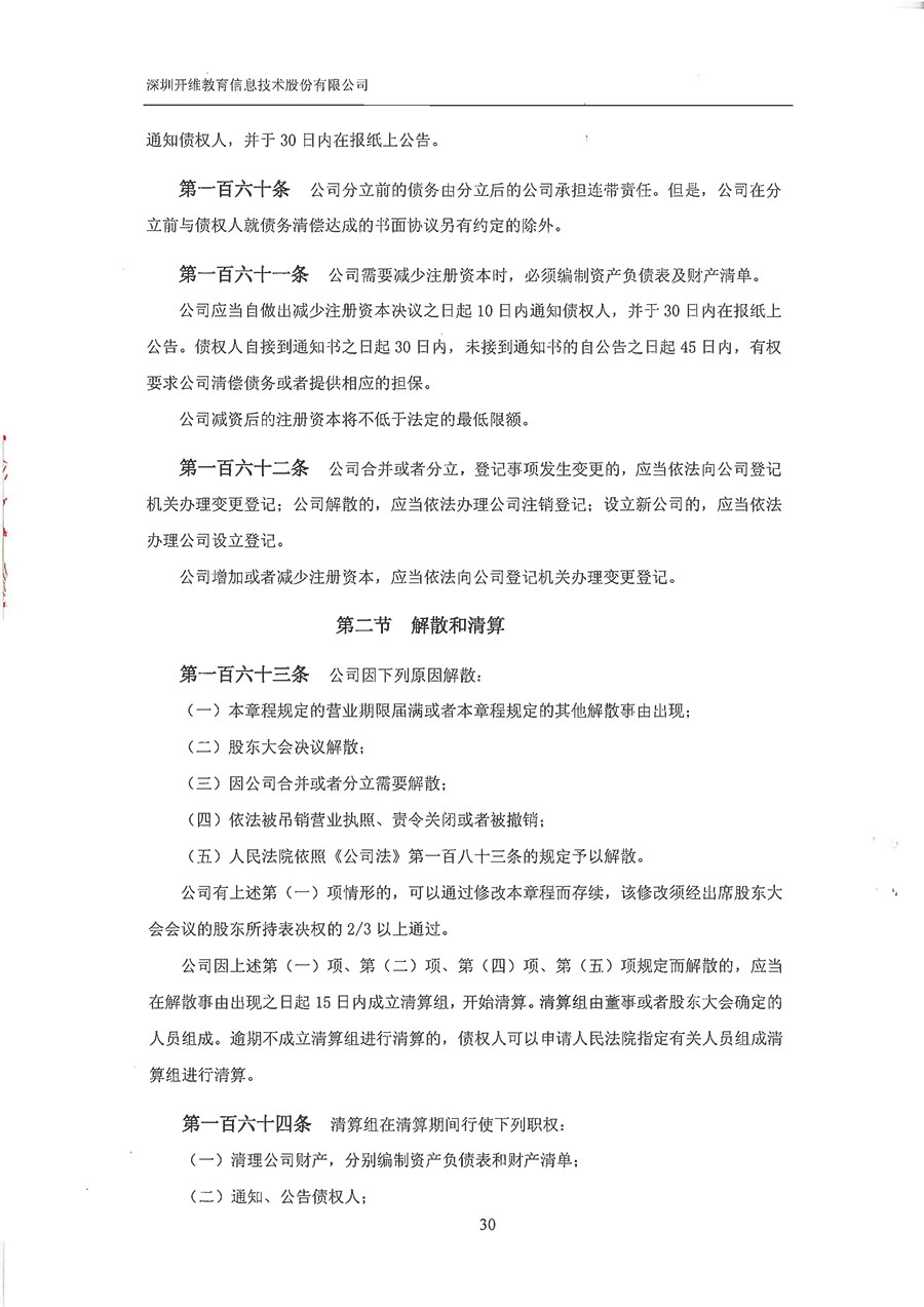 摘要:为维护深圳开维教育信息技术股份有限公司、股东和债权人的合法权益、规范公司的组织和行为,根据《中华人民共和国公司法》、《中华人民共和国证券法》、《非上市公众公司监督管理办法》、《非上市公众公司监管指引第3号-章程必备条款》和其他有关规定,制定本章程。