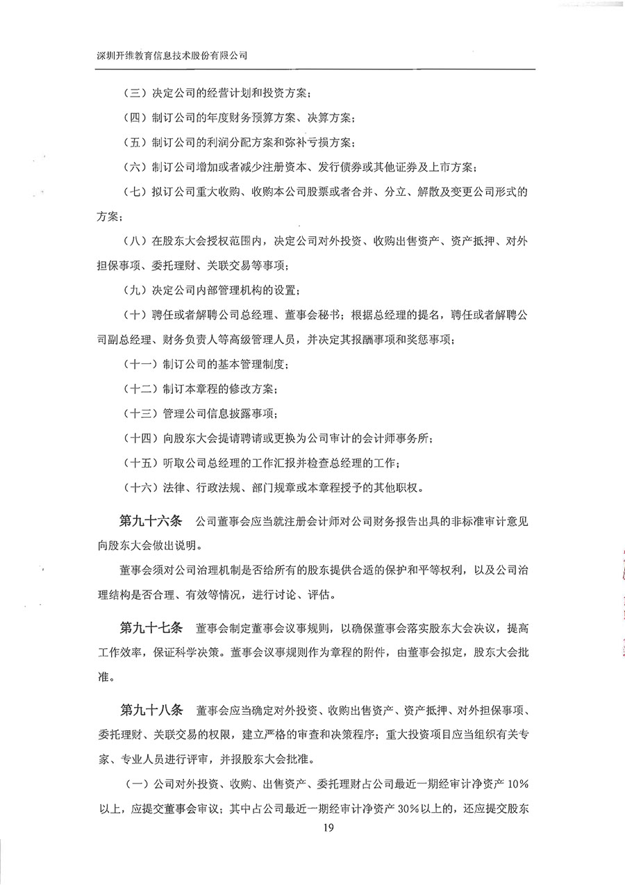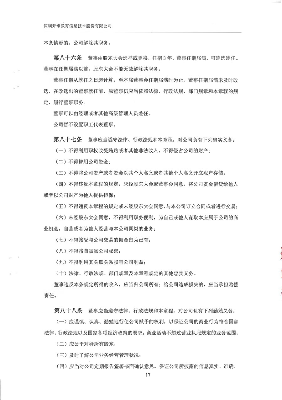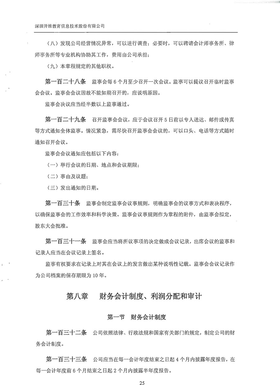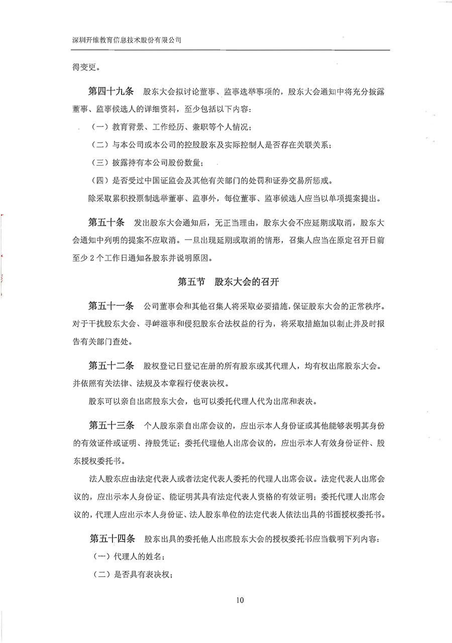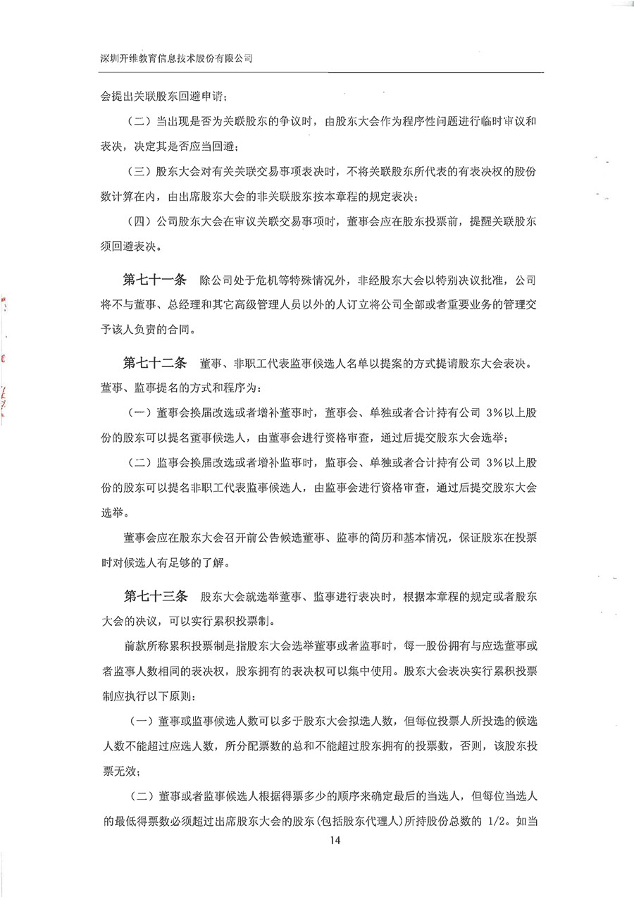 摘要:为维护深圳开维教育信息技术股份有限公司、股东和债权人的合法权益、规范公司的组织和行为,根据《中华人民共和国公司法》、《中华人民共和国证券法》、《非上市公众公司监督管理办法》、《非上市公众公司监管指引第3号-章程必备条款》和其他有关规定,制定本章程。