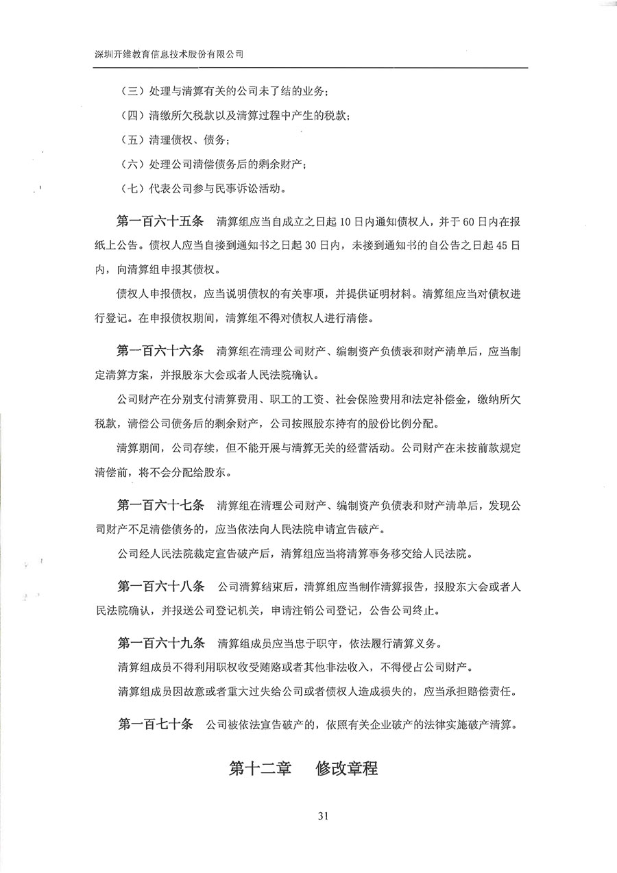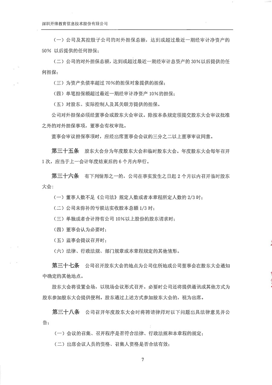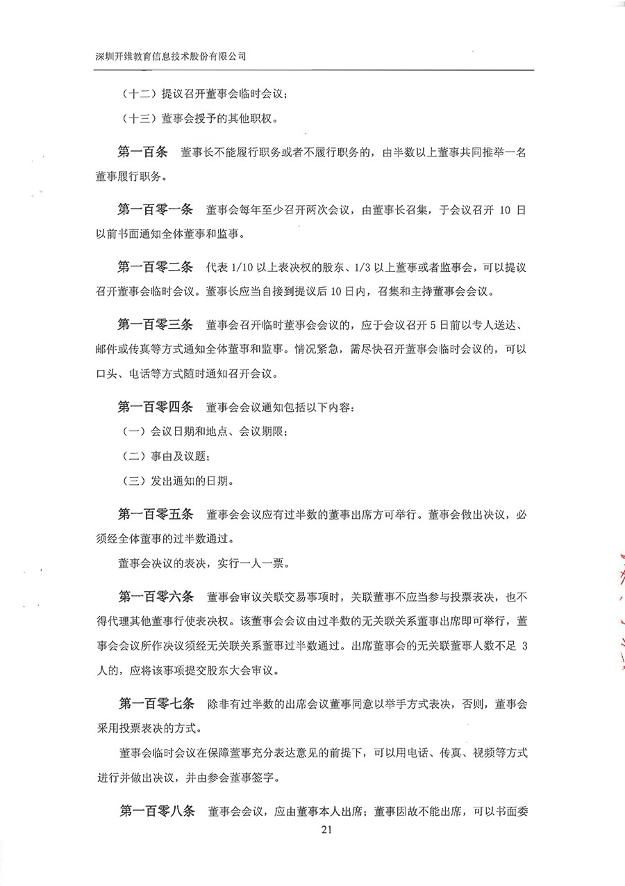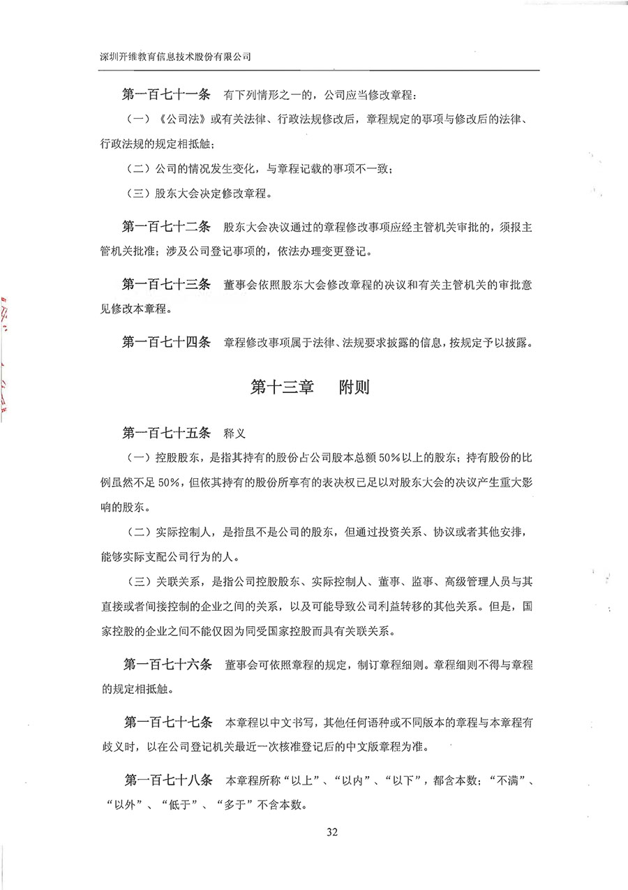 摘要:为维护深圳开维教育信息技术股份有限公司、股东和债权人的合法权益、规范公司的组织和行为,根据《中华人民共和国公司法》、《中华人民共和国证券法》、《非上市公众公司监督管理办法》、《非上市公众公司监管指引第3号-章程必备条款》和其他有关规定,制定本章程。