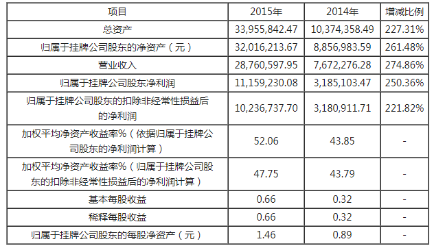 2015 年,公司按照董事会确立的战略思路,扎实工作,奋力拼搏,取得了经营业绩持续增长、管理品质大幅提升的全面丰收。报告期内,公司实现营业总收入 2,876.06 万元,同比增加 274.86%;归属于挂牌公司股东的净利润 1,115.92 万元,同比增加 250.36%;至报告期末总资产 3,395.58 万元,同比增长 227.31%,归属于母公司的净资产 3,201.62 万元,同比增长 261.48%。